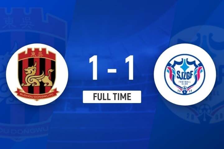 傷停補(bǔ)時(shí)8分鐘。全場比賽結(jié)束,蘇州東吳1-1石家莊功夫。
