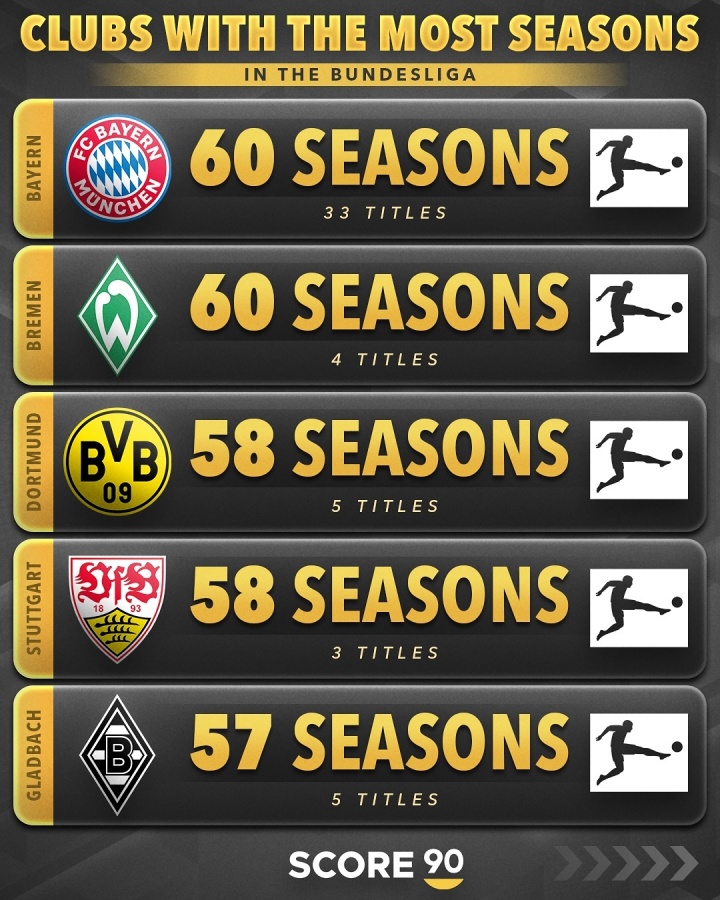 德甲參賽時(shí)長:拜仁60個(gè)賽季33冠 不萊梅60賽季4冠 多特58賽季5冠