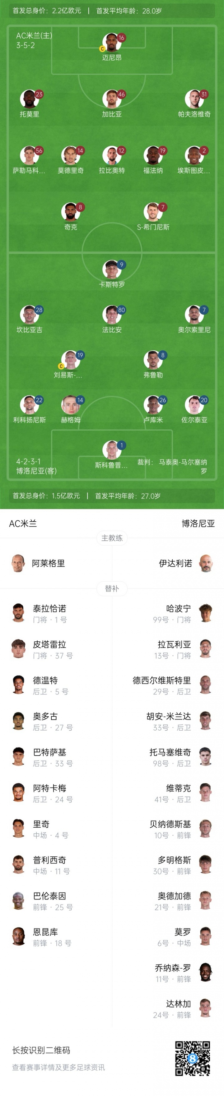 AC米蘭首發(fā):16-邁尼昂、23-托莫里、46-加比亞、31-帕夫洛維奇、2-埃斯圖皮尼安、19-福法納、14-莫德里奇、12-拉比奧特、56-薩勒馬科爾斯、8-奇克、7-S·希門尼斯