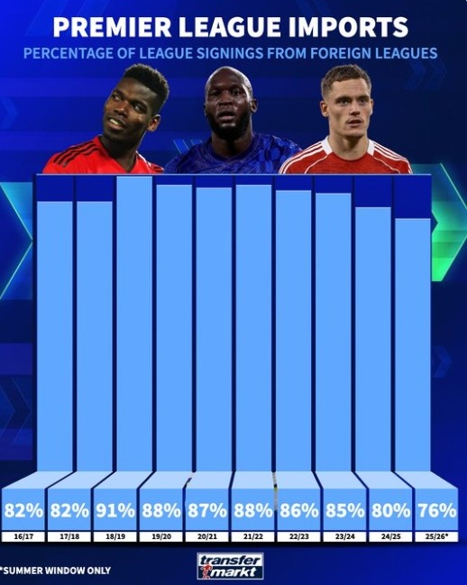 內(nèi)部消化!英超俱樂部今夏從國外引援比例為76%,創(chuàng)近10年新低