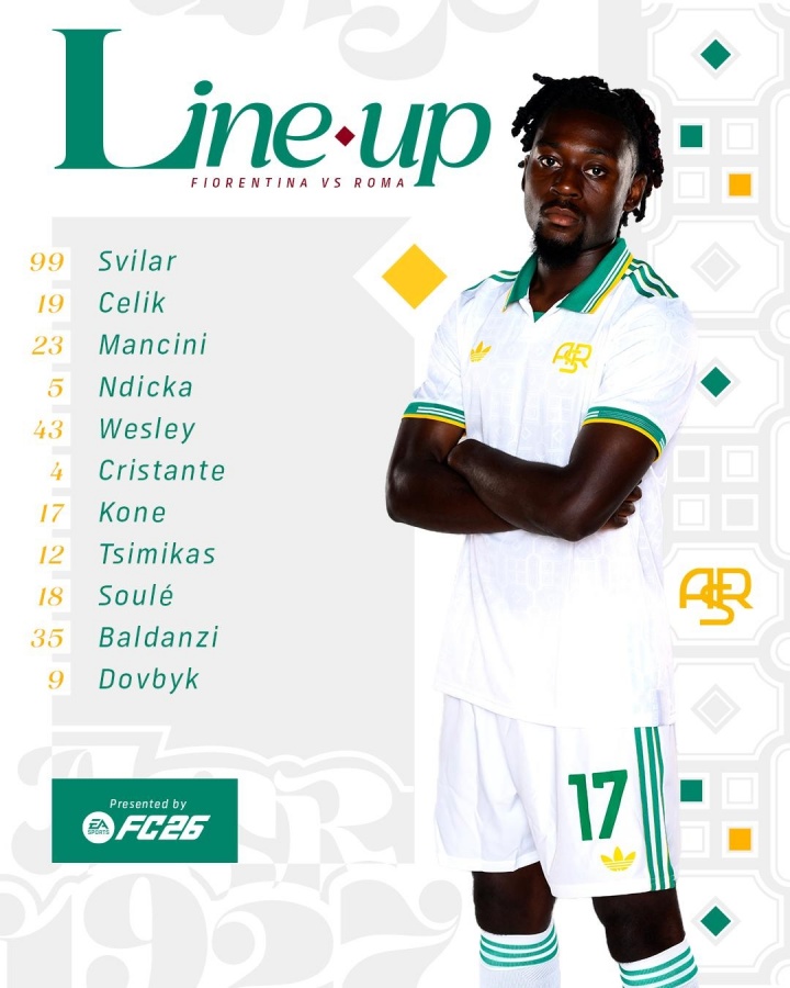羅馬首發(fā):99-斯維拉爾、19-切利克、23-曼奇尼、35-巴爾丹齊、5-恩迪卡、43-韋斯利、12-齊米卡斯、4-克里斯坦特、17-科內、18-蘇萊、9-多夫比克