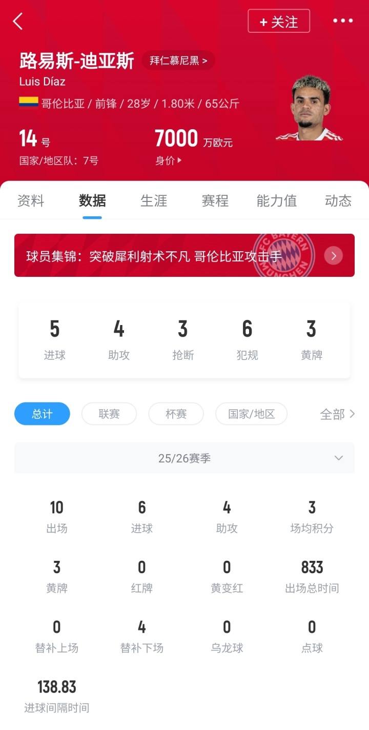 10場6球4助!TA:批評7000萬簽迪亞斯?但他是拜仁能簽的最佳人選