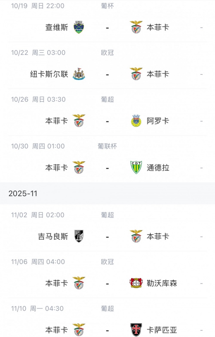 在10月國(guó)際比賽日結(jié)束后,本菲卡10月19日在葡杯第三輪客場(chǎng)挑戰(zhàn)查維斯,22日迎來(lái)歐冠客場(chǎng)對(duì)陣紐卡的比賽,26日的葡超回到主場(chǎng)對(duì)陣阿羅卡。
